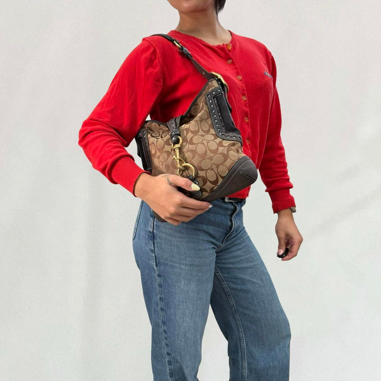 Authentic Y2K Coach hobo bag featuring the signature “C” monogram print in brown canvas with navy leather trim and brass hardware detailing. The bag has that classic early 2000s look with a front buckle clasp and slouchy silhouette. It’s some wear but still has plenty of life left, adding to its authentic vintage charm. ✨ Features: • Brand: Coach • Era: Y2K / Early 2000s • Color: Brown with navy leather trim • Material: Canvas & leather with brass hardware • Style: Signature hobo shoulder bag • Condition: Worn vintage condition, signs of wear but lots of life left • Perfect for: Y2K fashion lovers, vintage collectors, everyday casual looks